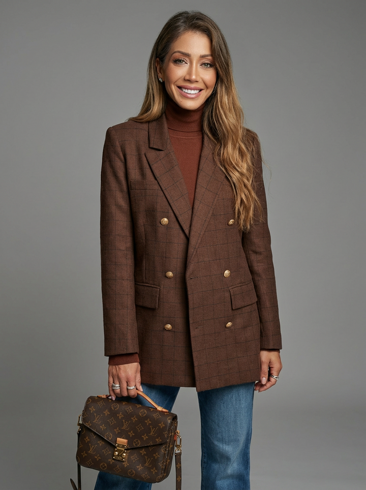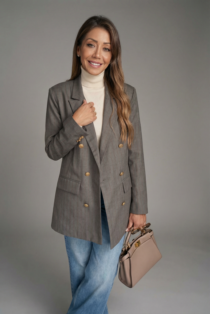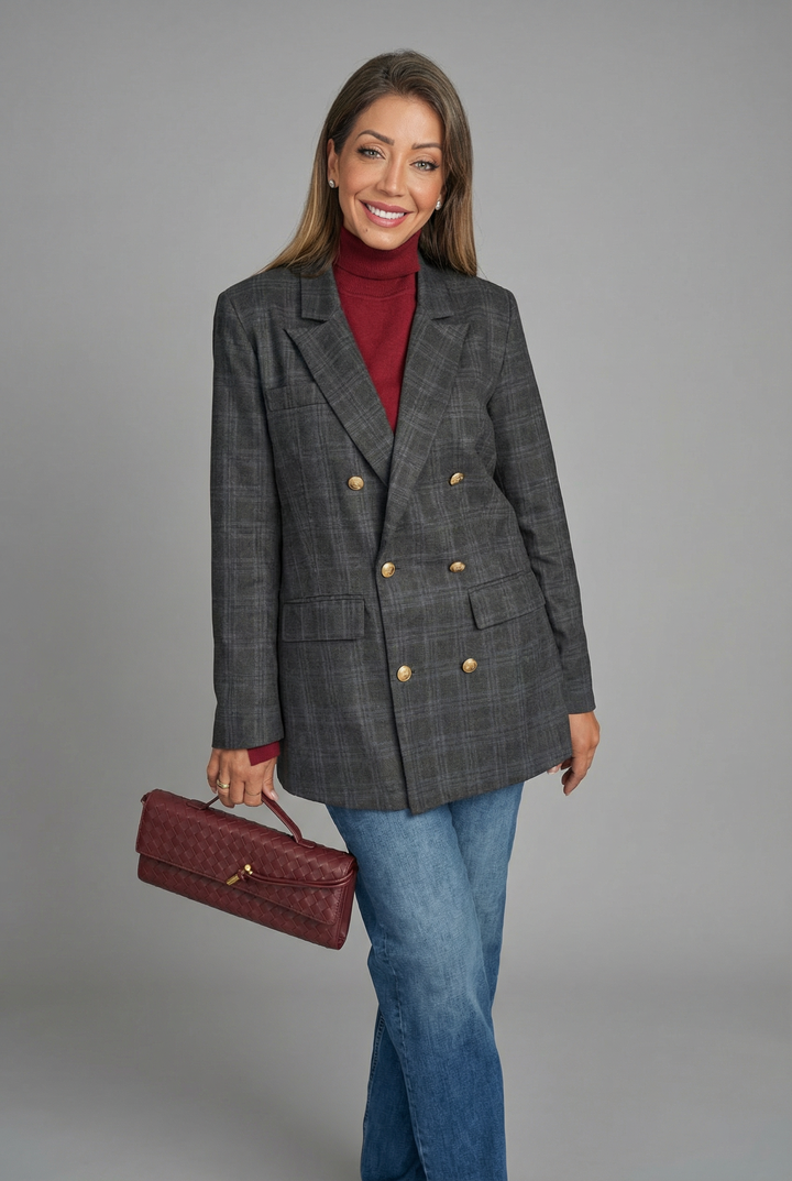 سترة كلاسيكية وخالدة من الصوف مزدوجة الصدر مع تفاصيل أزرار ذهبية عتيقة معدنية ووسادات كتف. مبطنة بساتان عالي الجودة. قطعة لهواة الجمع يجب اقتناؤها هذا الشتاء والعديد من الشتاءات القادمة.