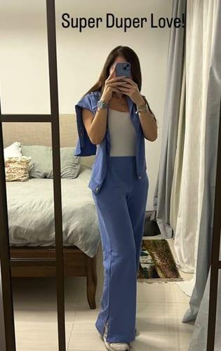 بدلة رياضية ميلتون عالية الجودة. مع رقبة قمع معدنية ذهبية اللون وجزء علوي مرتفع ومنخفض مع زر معدني ذهبي على كل جانب. بنطال بقصة واسعة مع فتحة تهوية في الأسفل. مثالية للحجاب والفتيات المتواضعات.