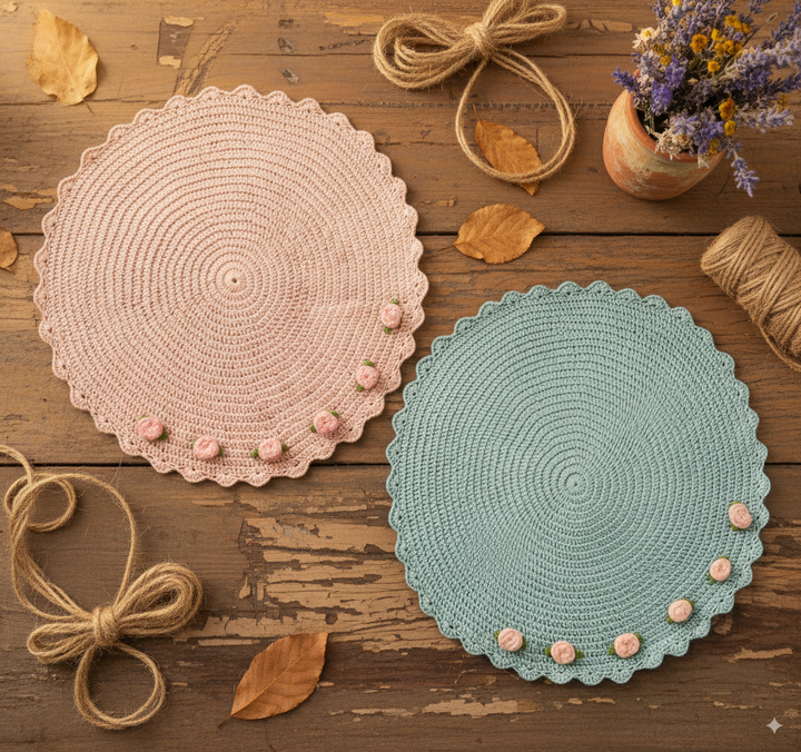 تعتبر مفارش الأطباق الكروشيه على طراز الجدة من العناصر الأساسية المريحة المثالية لطاولتك! نحن نحب تصميمها مع مجموعتنا المطابقة!