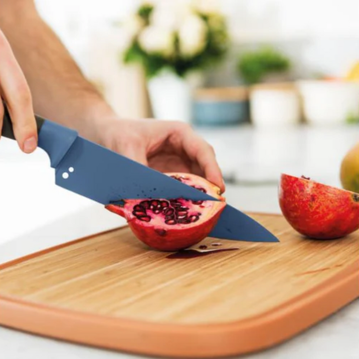 This small chef’s knife is the perfect example of a Leo tool, combining several functions in a single utensil while adding a colourful touch to your kitchen. The stainless steel knife with non-stick coating is great for various chopping tasks while the integrated herb stripper helps you to get a handle on stemmed herbs such as rosemary, thyme or sage. Just pull the stems through the fitted hole, strip the leaves and start chopping!