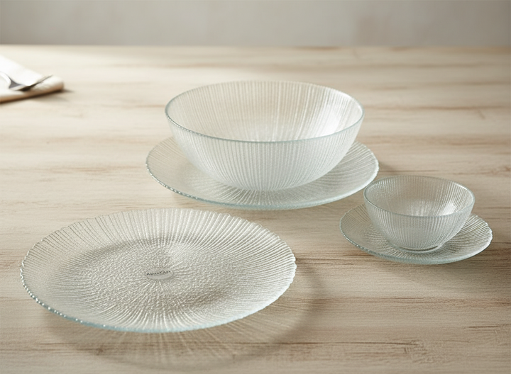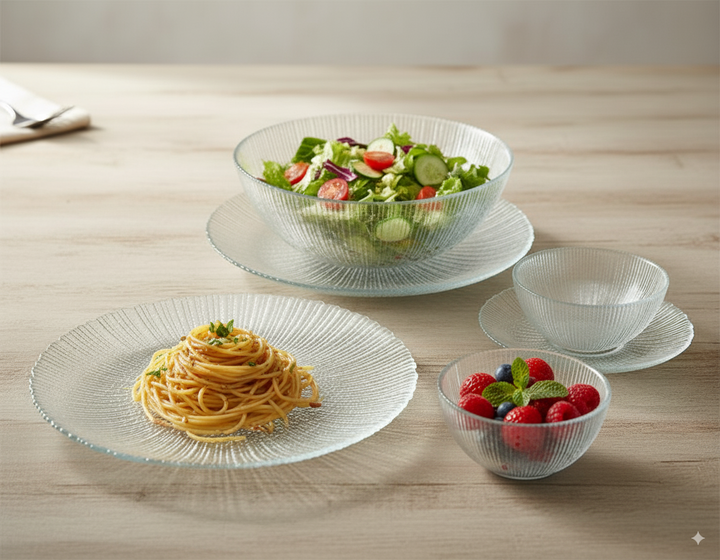 أرداكام سينترا للأناقة. طقم من ٢٥ قطعة: طبق تقديم (العمق ٢٨ سم × الارتفاع ٢ سم)، ٦ أوعية (العمق ٢٤ سم × الارتفاع ٨ سم)، ٦ أطباق عميقة (العمق ٢٠ سم × الارتفاع ٤ سم)، ٦ أطباق عشاء (العمق ٢١ سم × الارتفاع ٢ سم)، و٦ أوعية صغيرة (العمق ١٥ سم × الارتفاع ٦.٥ سم).