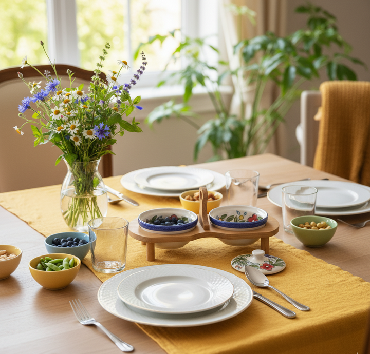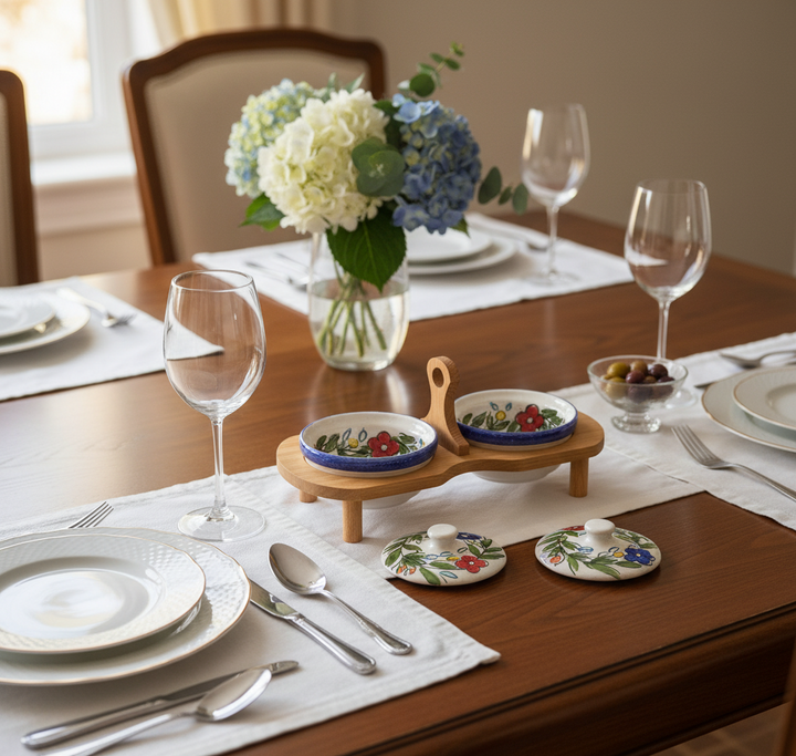 ارتقِ بتجربة طعامك مع طقم الأطباق الفلسطيني الرائع هذا. يتميز هذا الطقم بأوعية طينية مصنوعة يدويًا مع صينية خشبية مصنوعة يدويًا، ويمزج بين سحر التراث والأناقة العصرية، مما يجعله مثاليًا لتقديم الصلصات والمكسرات والحلويات بأناقة.