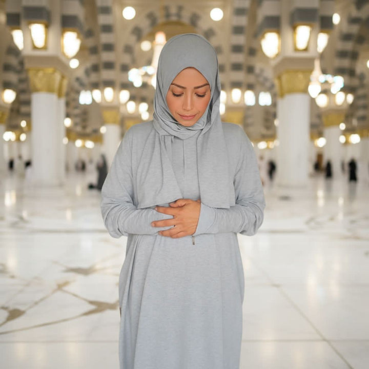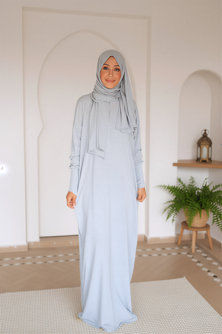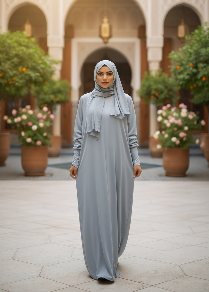 تصميمها بسيط وكاجوال، بحجاب مدمج بيكمل الإطلالة بأناقة هادئة.مصنوعة من قطن مصري نقي 100%، خامة خفيفة وناعمة على البشرة، تسمح بالتهوية وتناسب كل المواسم.قصتها الانسيابية بتمنحك راحة وأناقة في الحركة، من السفر للعمرة، لصلاتك، أو حتى ليومك العادي.