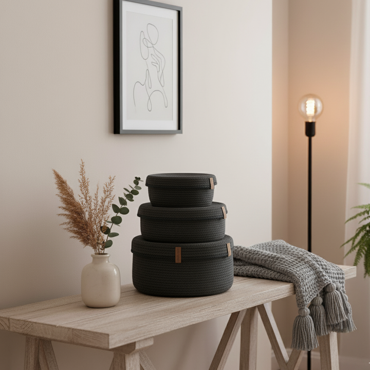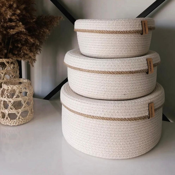 "Handmade woven storage basket with lid can be used indoors and outdoors".