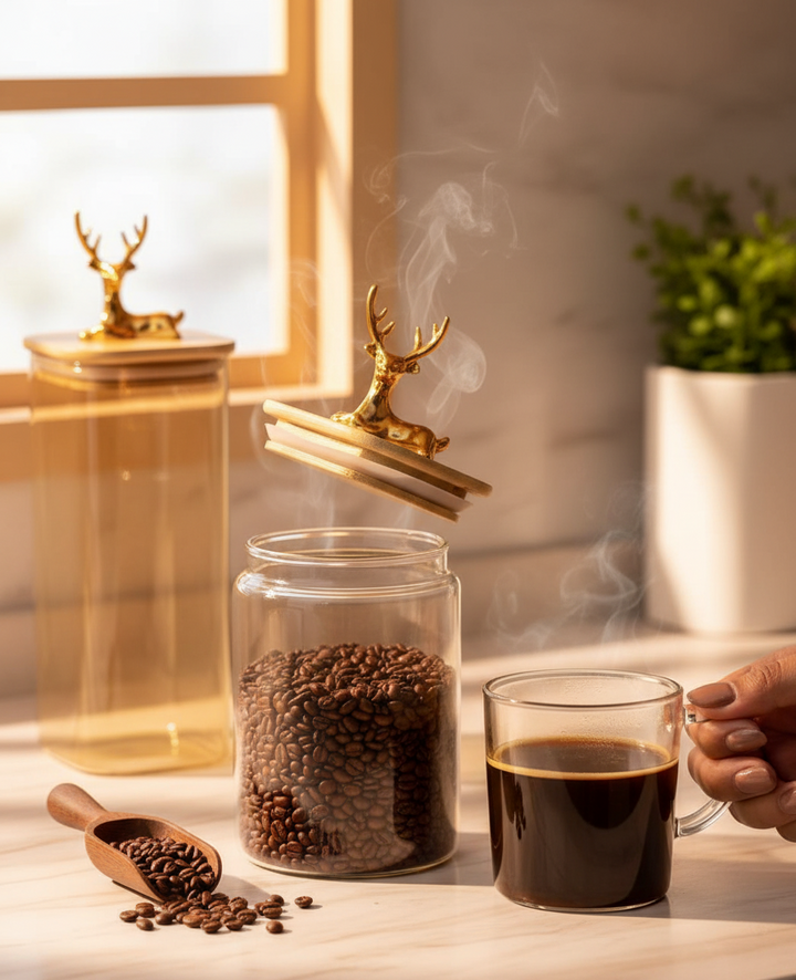 Elegant Design: These stylish kitchen storage containers feature a chic glass body with a sleek metallic gold lid adorned with a deer figurine.