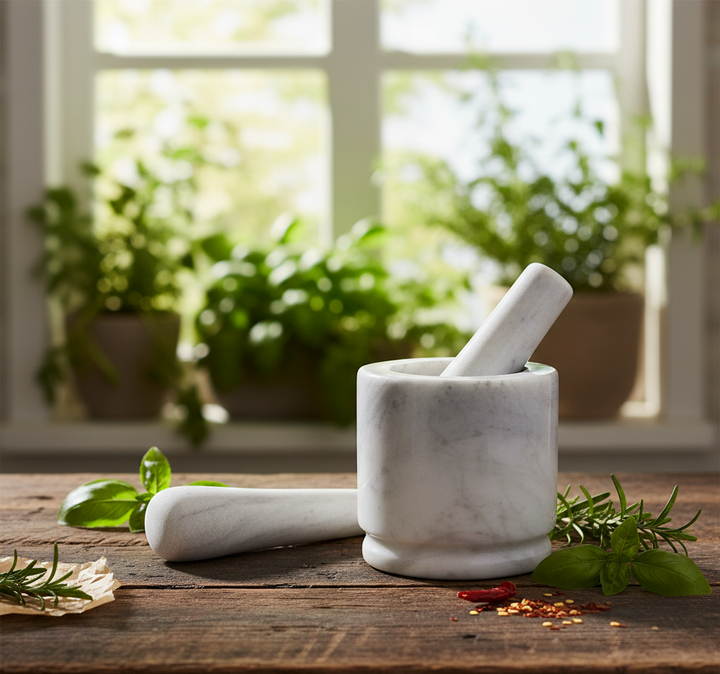 This mortar & pestle is a marble marvel made to be passed from one generation to another. With its modern look and carefully designed details, you will have a useful, timeless piece of art.