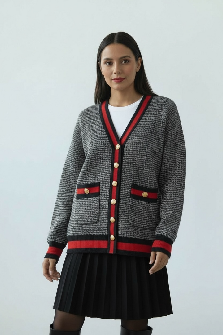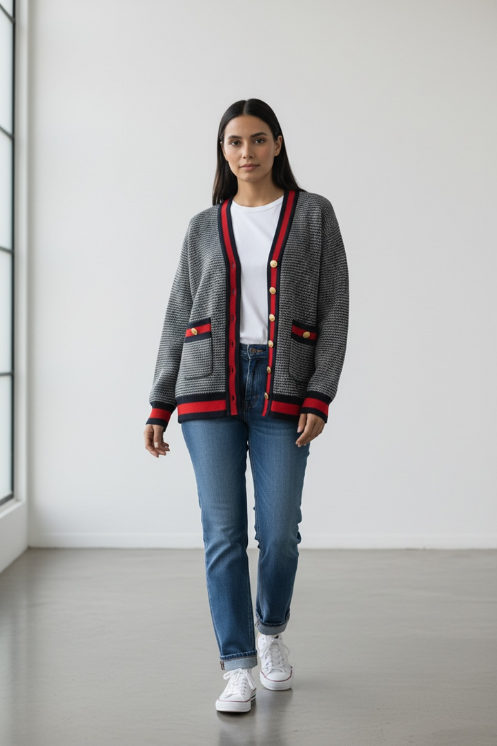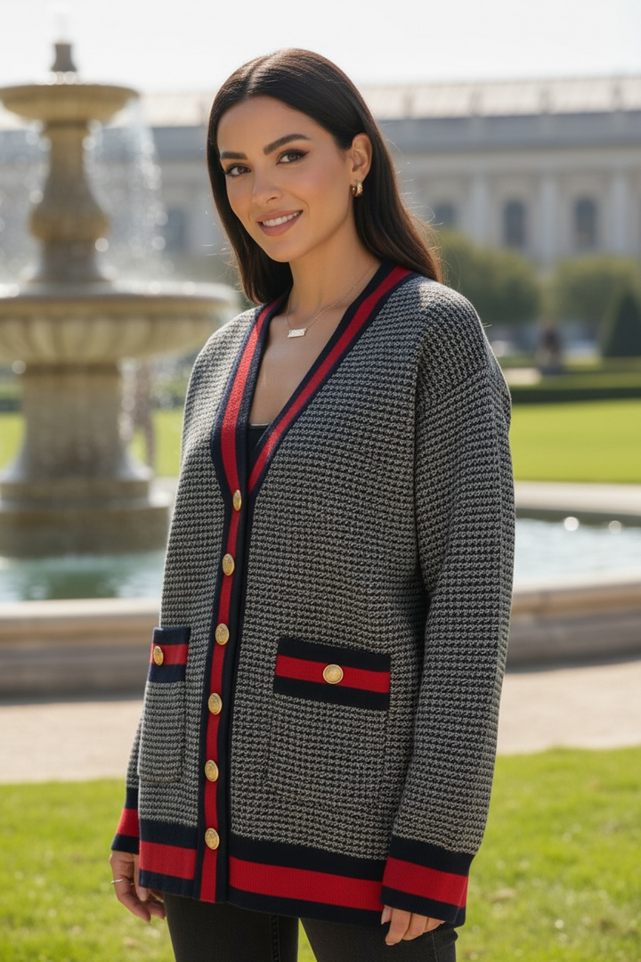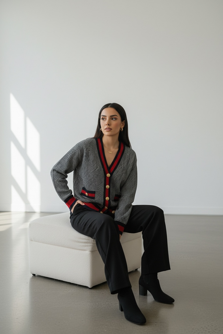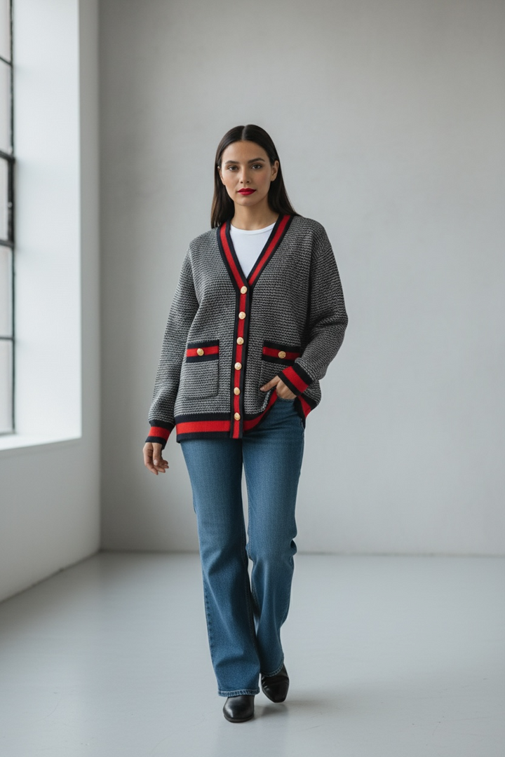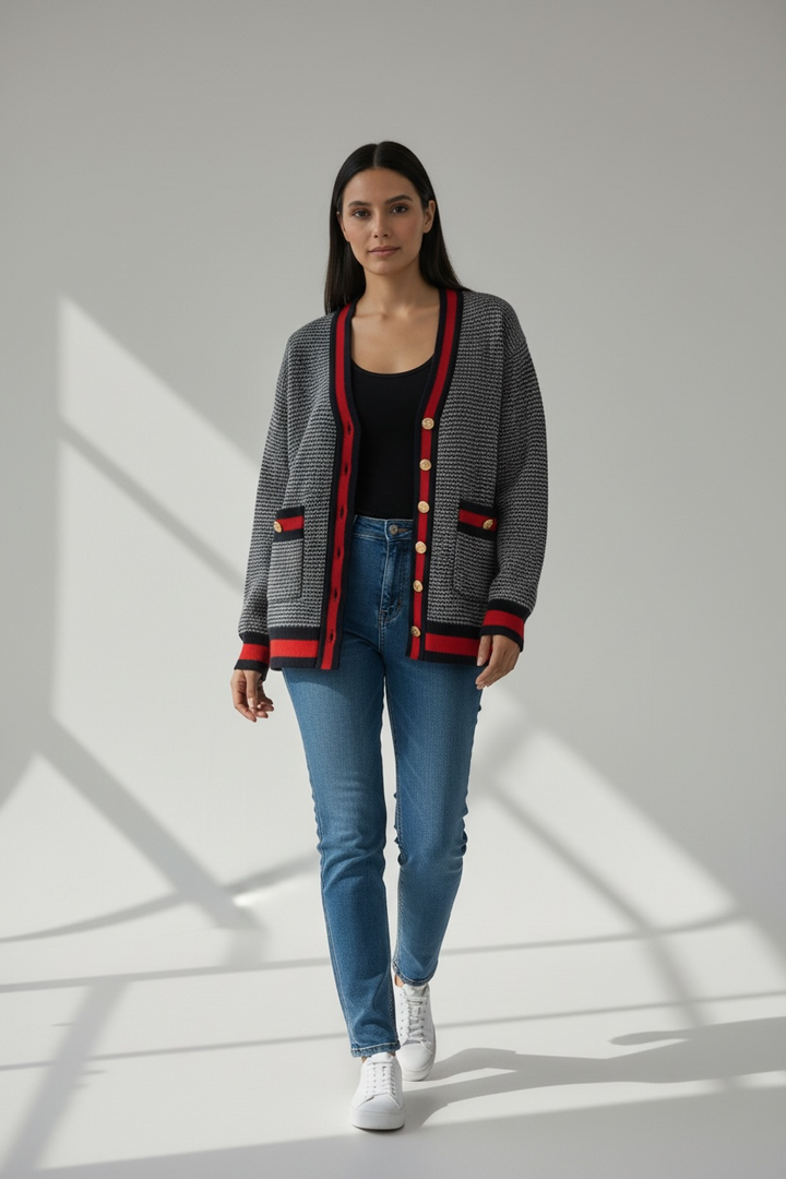 ارتدي أناقة مريحة مع هذا الكارديجان التريكو الناعم،  كحلي غامق مع الاحمر القاني المصنوع من خيوط عالية الجودة ومحاك بدقة ليمنحك خامة راقية ومظهرًا أنيقًا. يتميّز بنقشة ستايل شانيل وأزرار معدنية قديمة تضيف لمسة شيك ومتجددة.