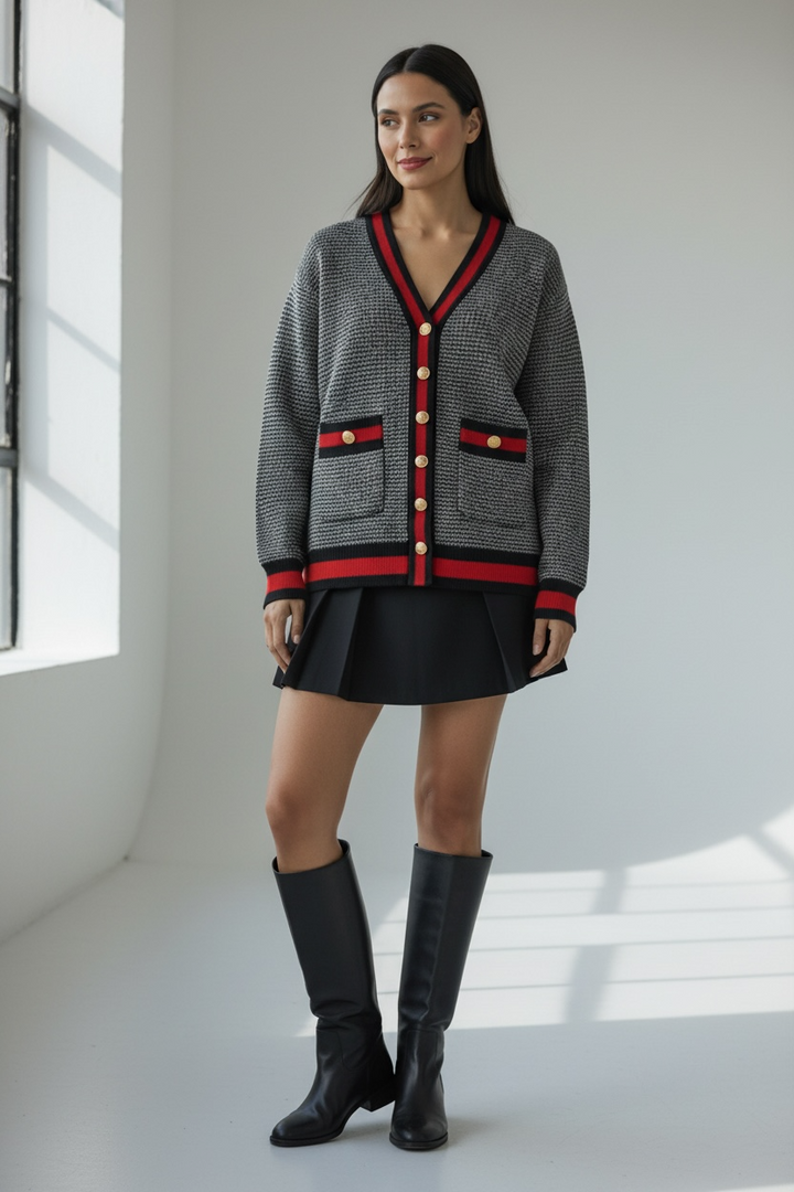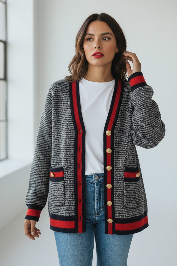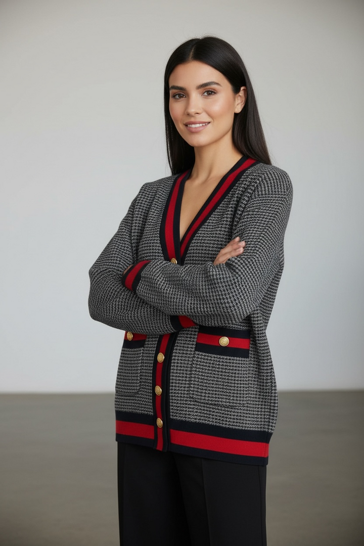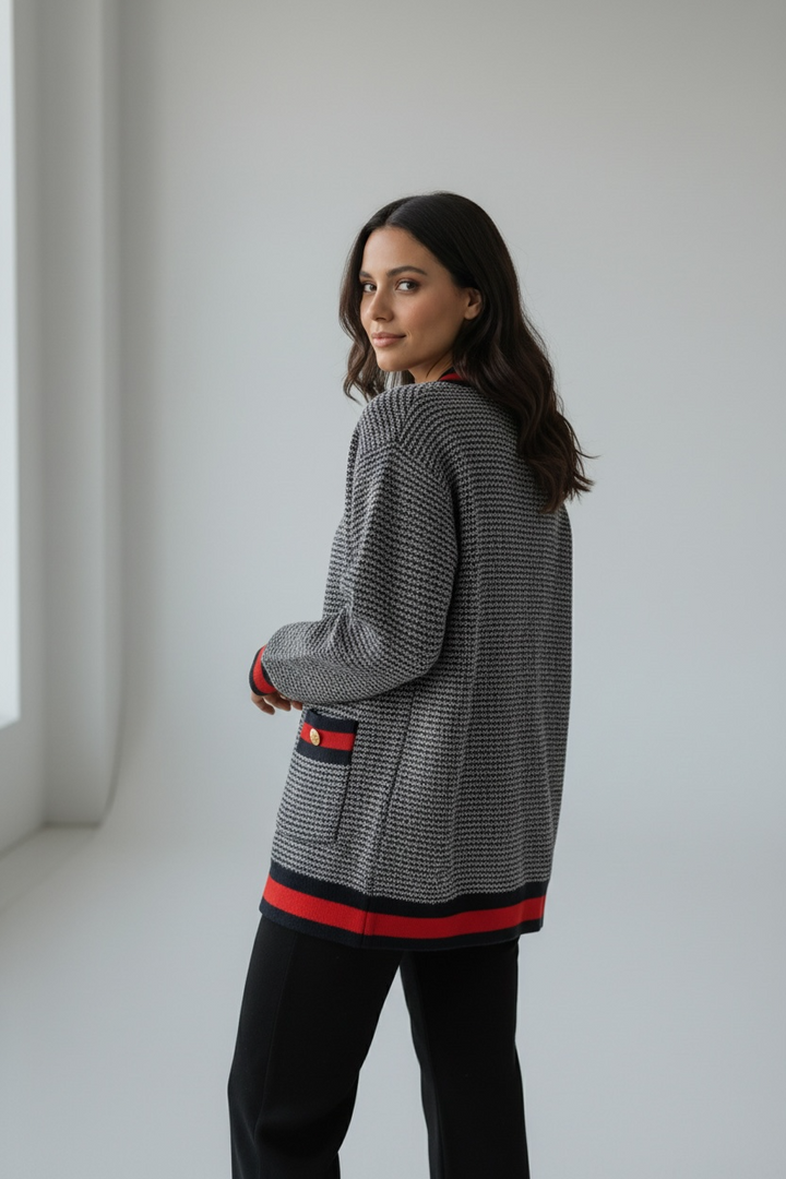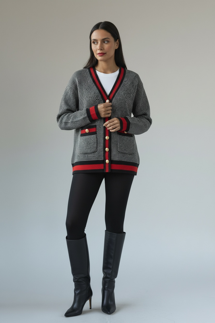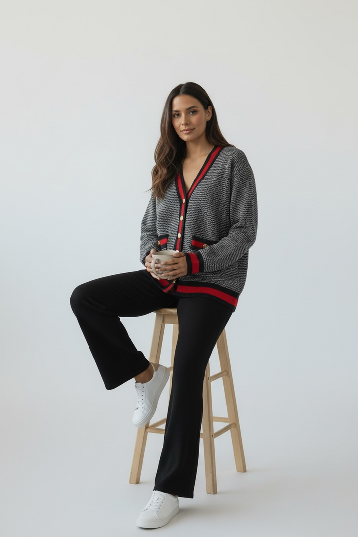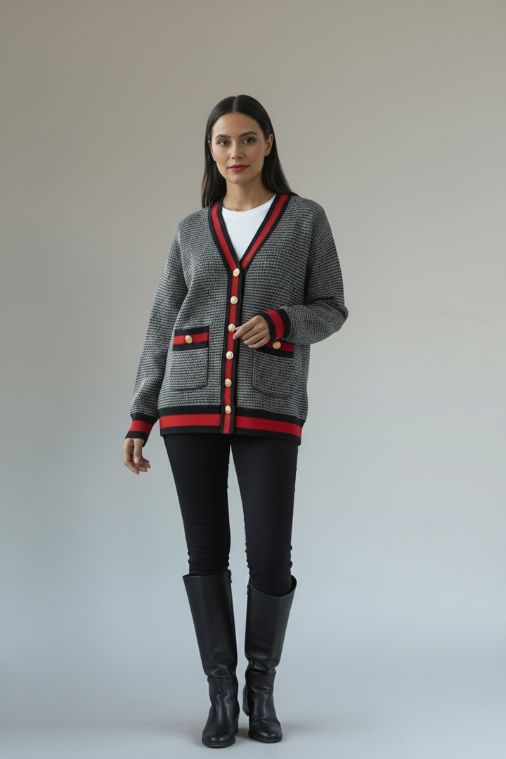 ارتدي أناقة مريحة مع هذا الكارديجان التريكو الناعم،  كحلي غامق مع الاحمر القاني المصنوع من خيوط عالية الجودة ومحاك بدقة ليمنحك خامة راقية ومظهرًا أنيقًا. يتميّز بنقشة ستايل شانيل وأزرار معدنية قديمة تضيف لمسة شيك ومتجددة.