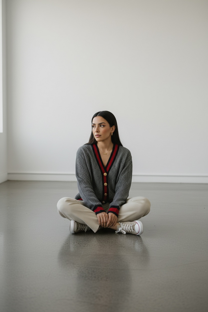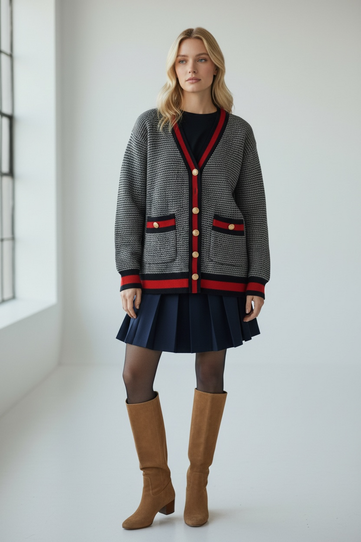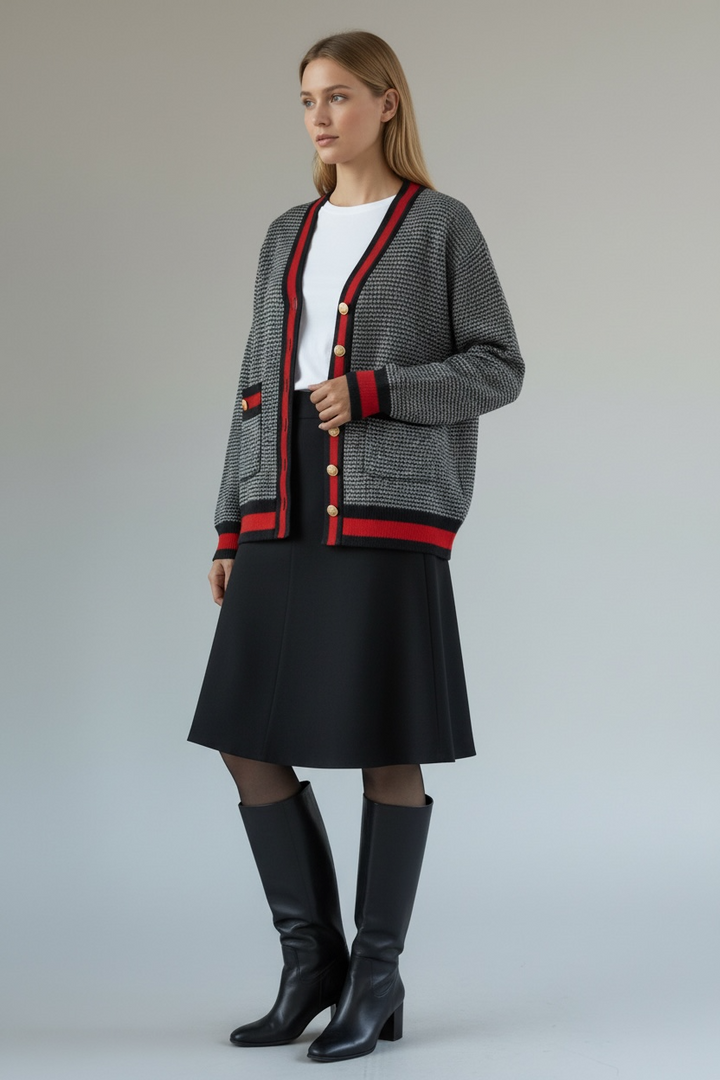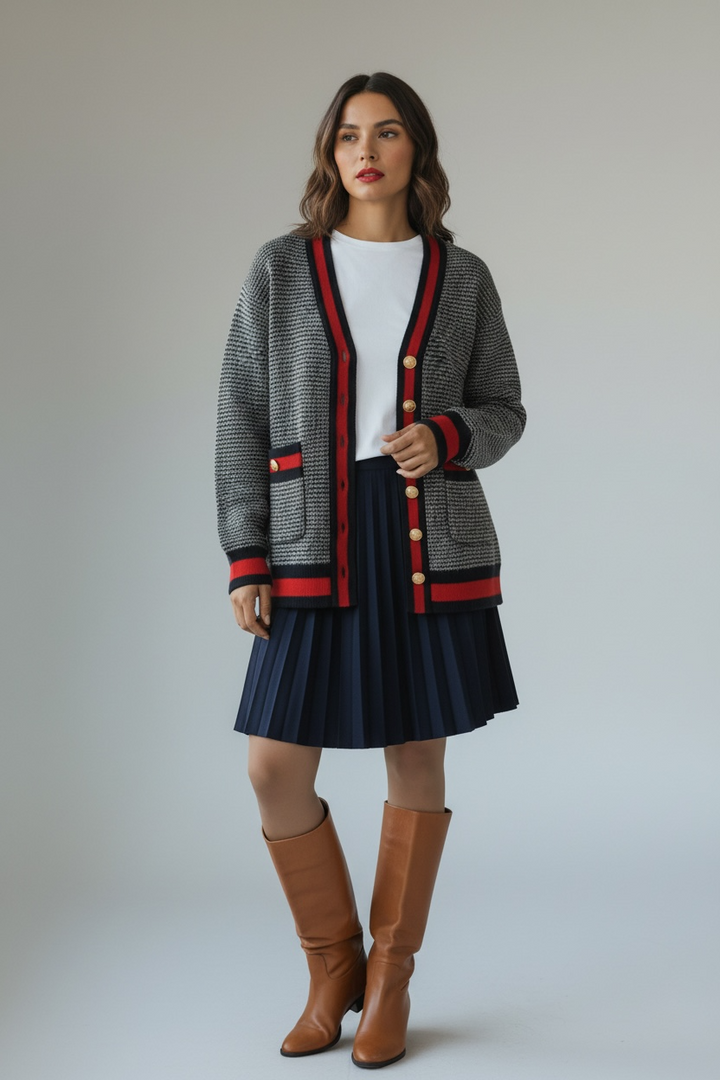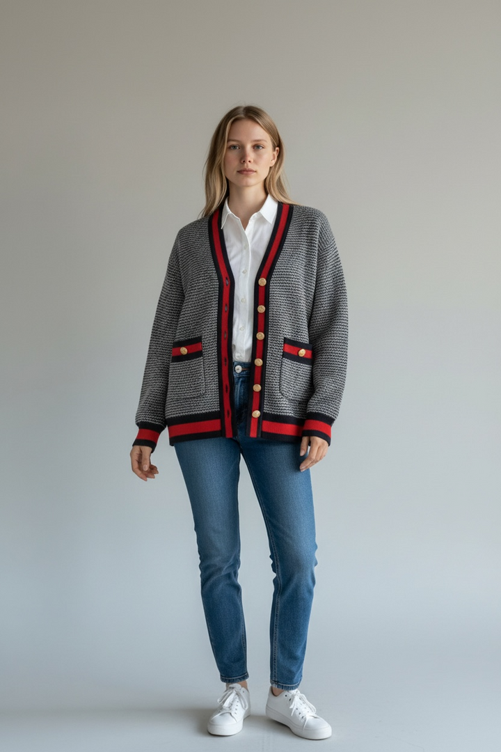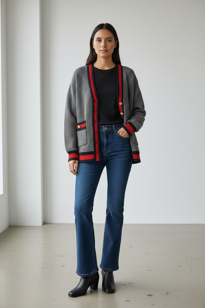 ارتدي أناقة مريحة مع هذا الكارديجان التريكو الناعم،  كحلي غامق مع الاحمر القاني المصنوع من خيوط عالية الجودة ومحاك بدقة ليمنحك خامة راقية ومظهرًا أنيقًا. يتميّز بنقشة ستايل شانيل وأزرار معدنية قديمة تضيف لمسة شيك ومتجددة.