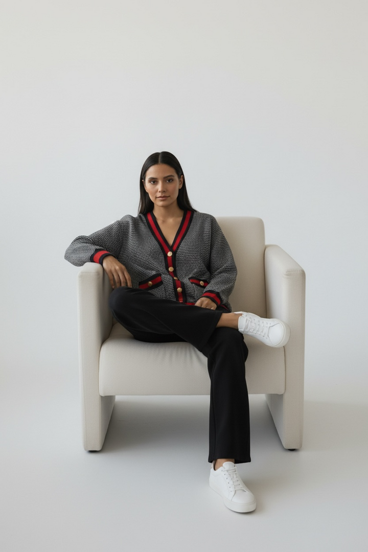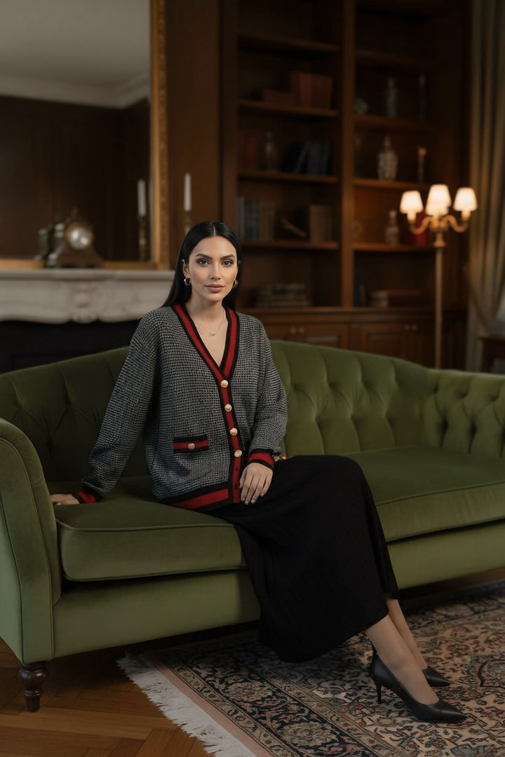 Wrap yourself in effortless elegance with this ultra-soft knitted cardigan, crafted from premium high-quality yarn and knitted to perfection. Designed with a timeless chanel print and finished with vintage metal buttons, it adds a chic, versatile touch to any outfit.