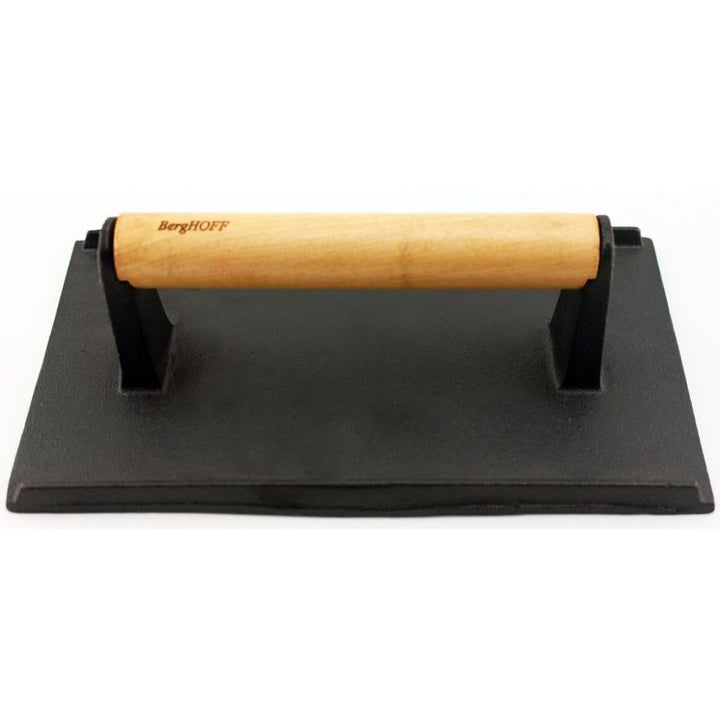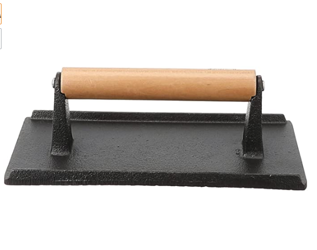 Heavy duty cast iron with hammered finish. Cast iron is known for it’s durable functionality, this bacon press cooks both sides evenly, leaving little room for shrinking. Also great for steaks and paninis!