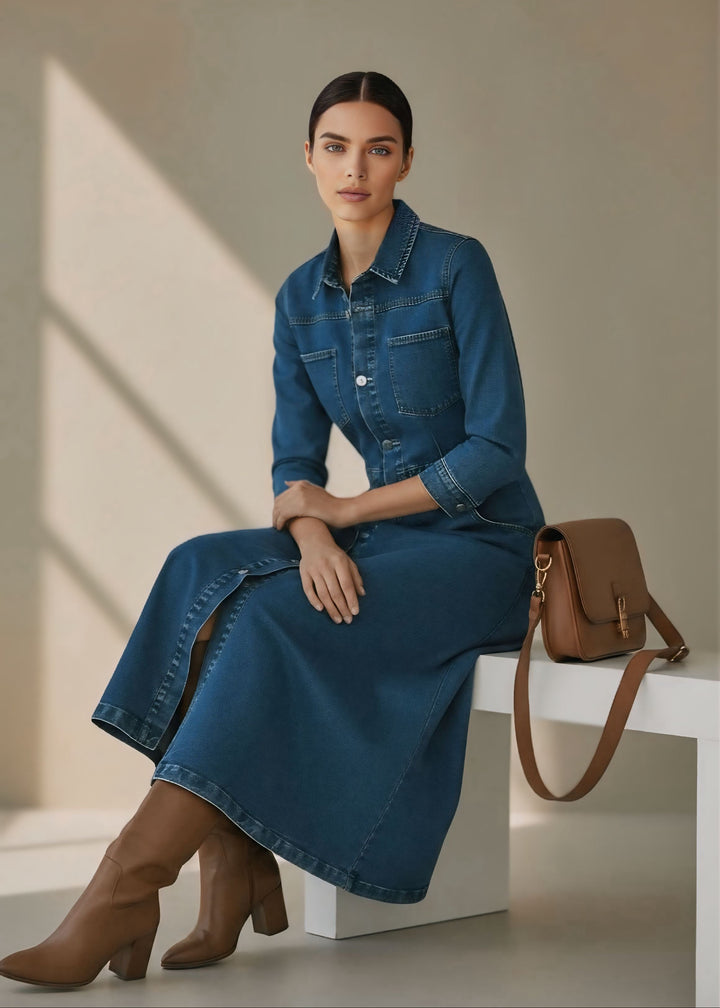 فستان Denim Safari هو القطعة المثالية لكل المواسم — من الشتاء إلى الصيف، وعلى مدار العام.