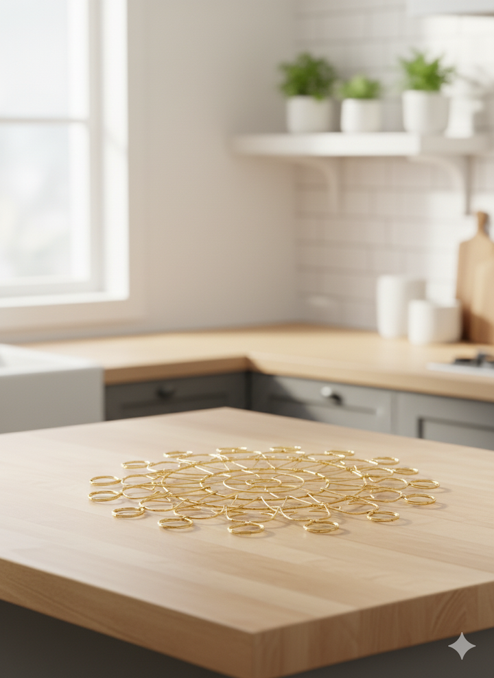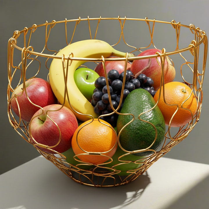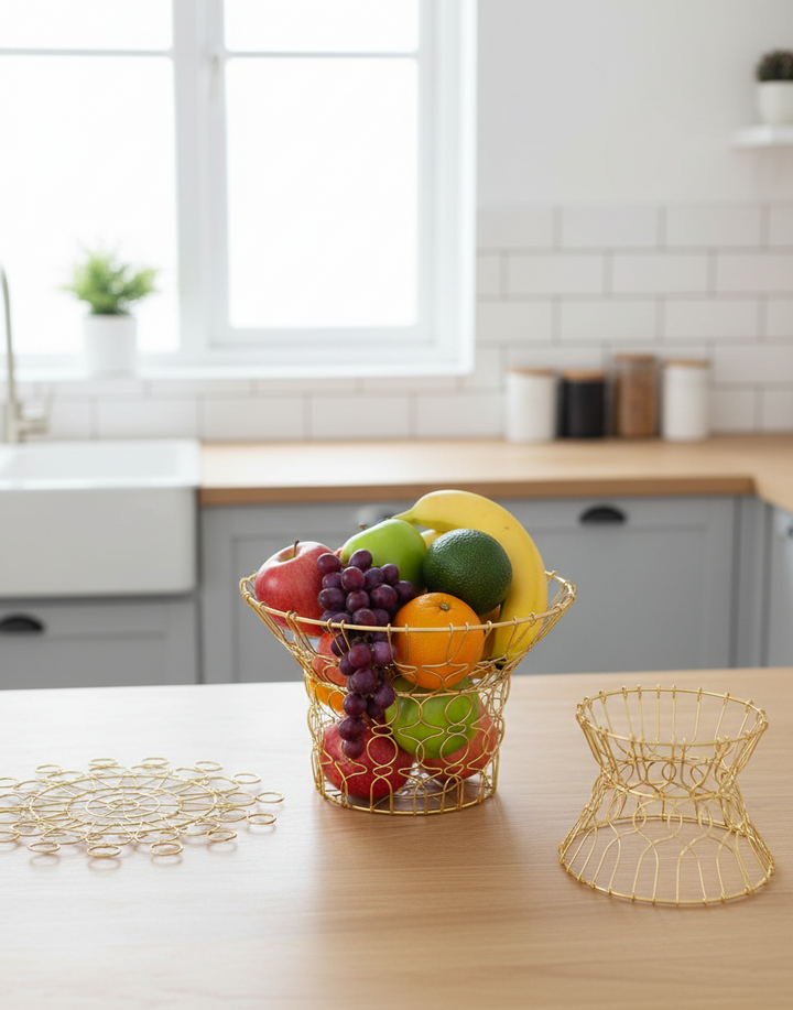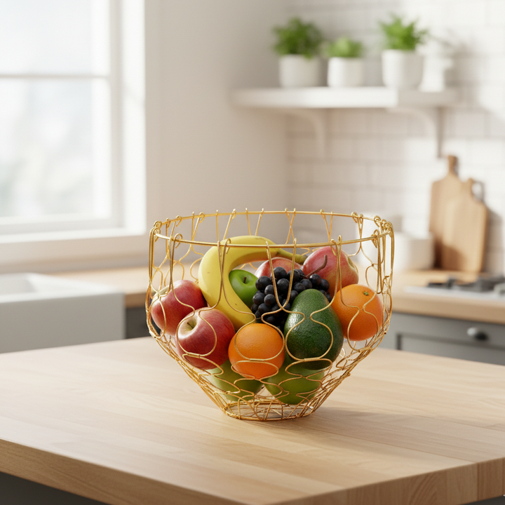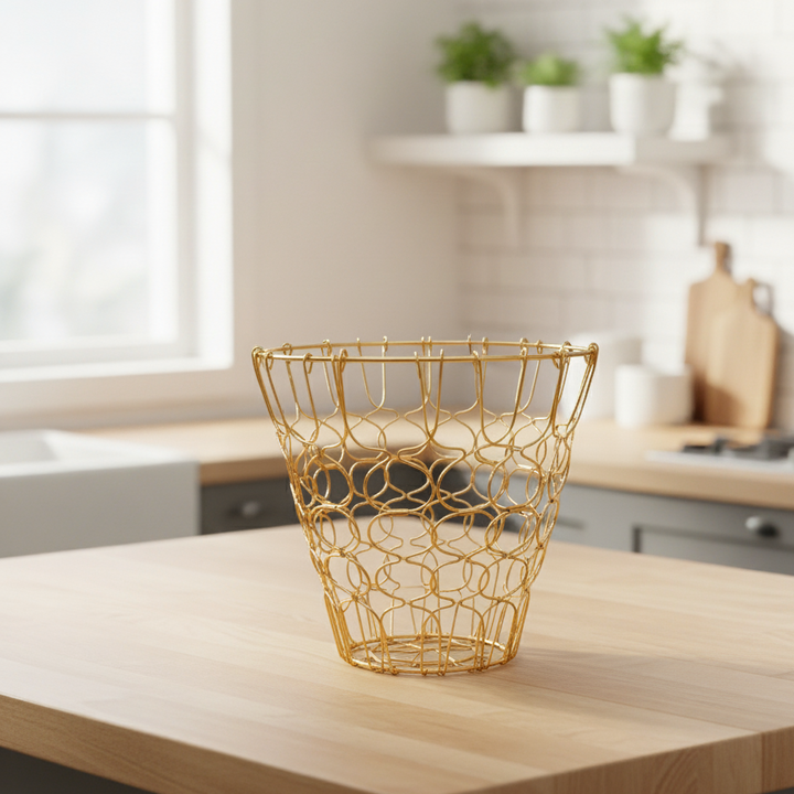 This flexible gold wire basket transforms into over 5 unique shapes, making it a versatile addition to your home or office. Use it as a fruit bowl, stationery holder, candle stand, or a chic storage bin — the possibilities are endless! Its sleek geometric design adds a modern touch, while the durable metal build ensures long-lasting style and function. Whether you're organizing your desk or decorating your dining table, this basket adapts to your space beautifully
