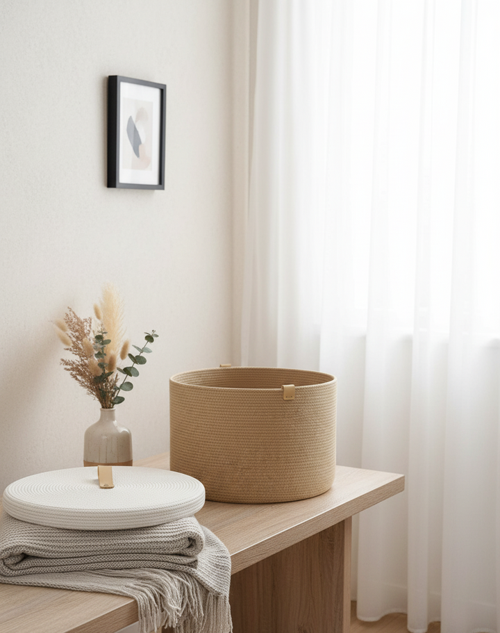 "Handmade Woven organizer & Storage Jute basket. Can be used in the bedroom, kids' room, kitchen, and Toilet."