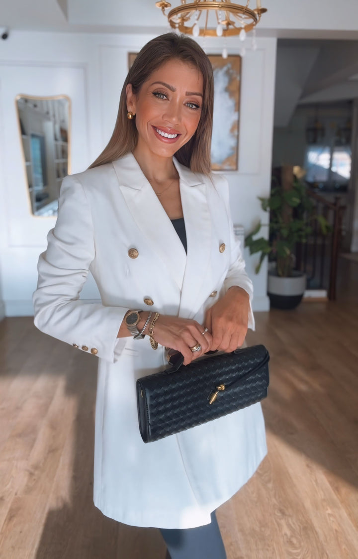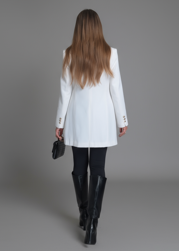 Its unique longline cut and double-breasted design bring timeless elegance and freedom of movement — a statement of effortless sophistication.