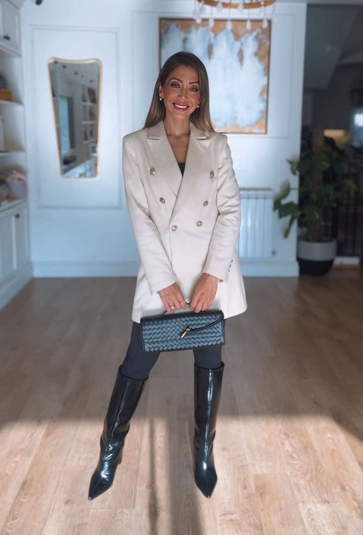 ‎تصميم مزدوج الأزرار ولمسة من الحِرفة تجعلها قطعة أساسية في خزانة كل امرأة تبحث عن الأناقة والراحة معاً.