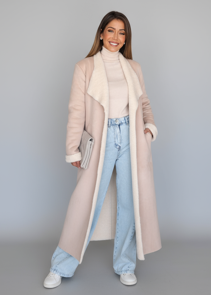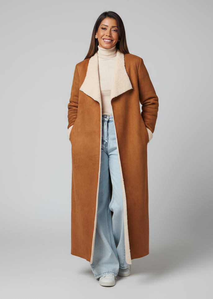 تغلّفي بدفءٍ ساحر دون عناء مع معطف السويد تيـدي — قطعة ناعمة بتصميم مميز، مصنوعة من خامة السويد الفاخرة بملمس زبدي وبطانة فرو ناعمة من الداخل.