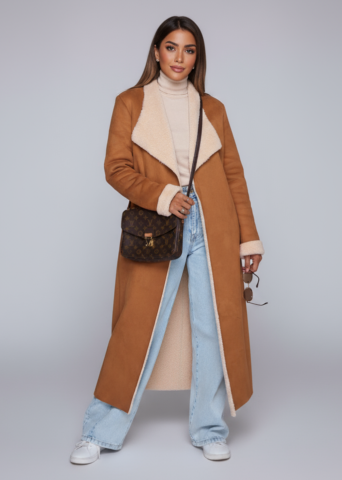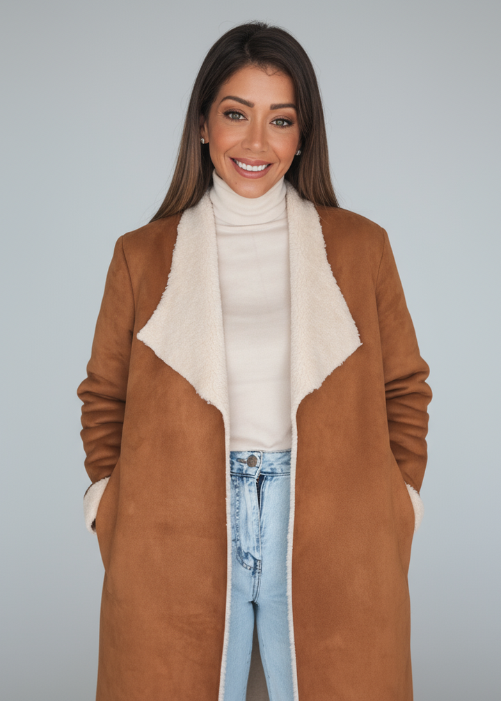 Wrap yourself in effortless warmth with The Suede Teddy Coat — a soft, statement piece crafted from buttery faux suede with plush inner lining. Its oversized silhouette, fur-trimmed collar, and cuff details bring a timeless winter elegance to any look.