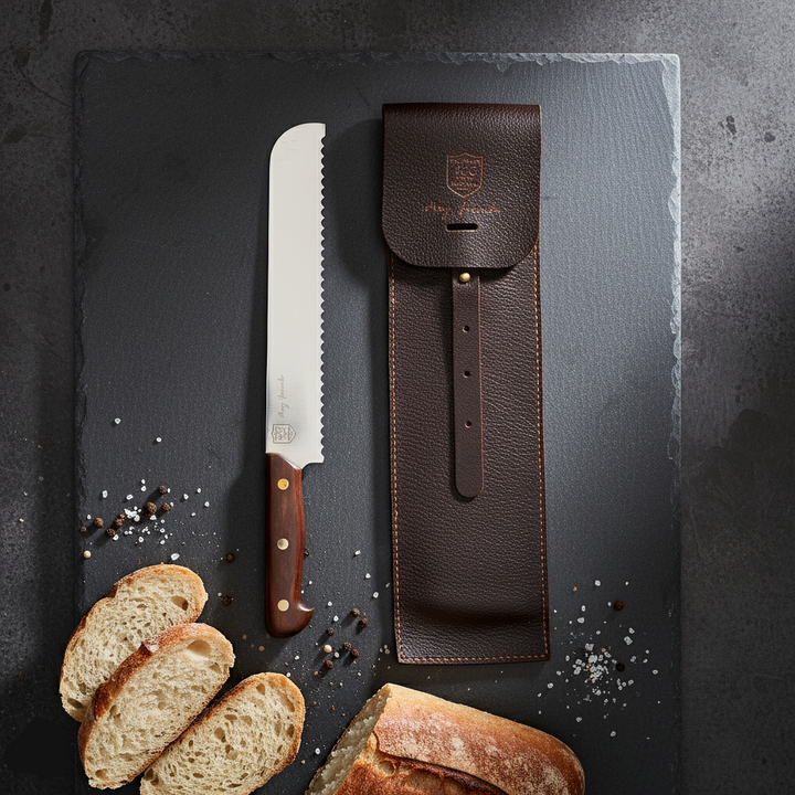 Designed by Chef May and Handcrafted in Egypt by Egyptian Custom Cutlery, 10in Inox Bread Knife, 2mm thickness, Ergonomically Contoured Handle, Madagascar Rosewood, Brass Fittings