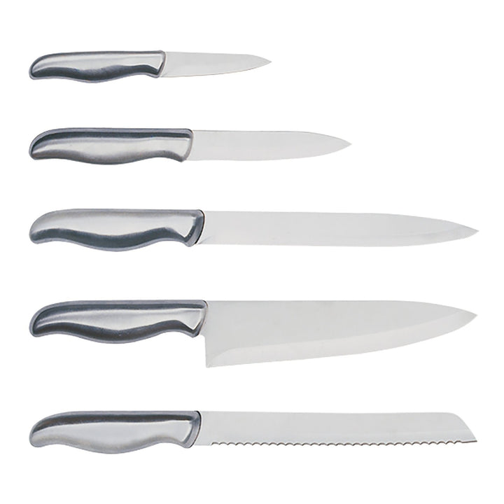 Want to jumpstart your knife collection? Then this 6 piece knife block is the way to go! This versatile set contains a hand-sharpened stainless steel paring knife, utility knife, carving knife, bread knife and chef’s knife. In the beautiful wooden knife block you can conveniently keep all these knives organized and within reach for efficient food preparation.