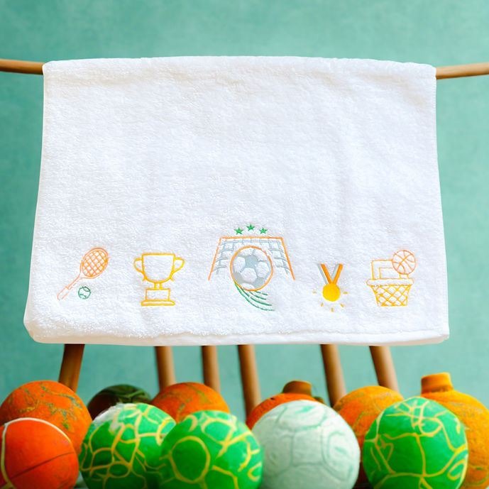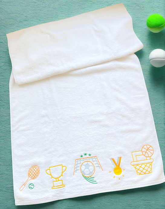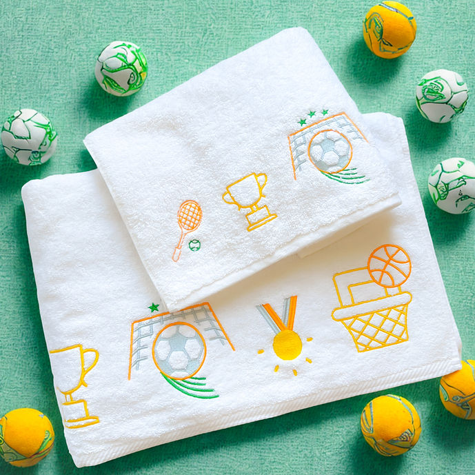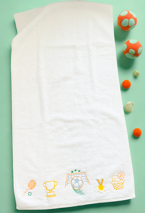 I'm your kids "boy" towel. I'm 100% Egyptian Giza (highest quality) Cotton Towel with an embroidered border on 1 end & 1 side of the towel. My other side has no borders.