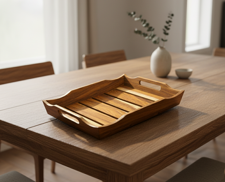A handcrafted tray made from 100% natural Sarsoaa wood, designed with elegance and inspired by the raw beauty of nature. Perfect for serving drinks or as a decorative accent on your table. It features fine details and a premium wood texture that adds a warm, rustic touch to any space.