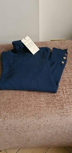 Soft wool-blend long-sleeve top with a high neck and golden buttons on the open-ended sleeves. A must-have piece this winter and many to come.
