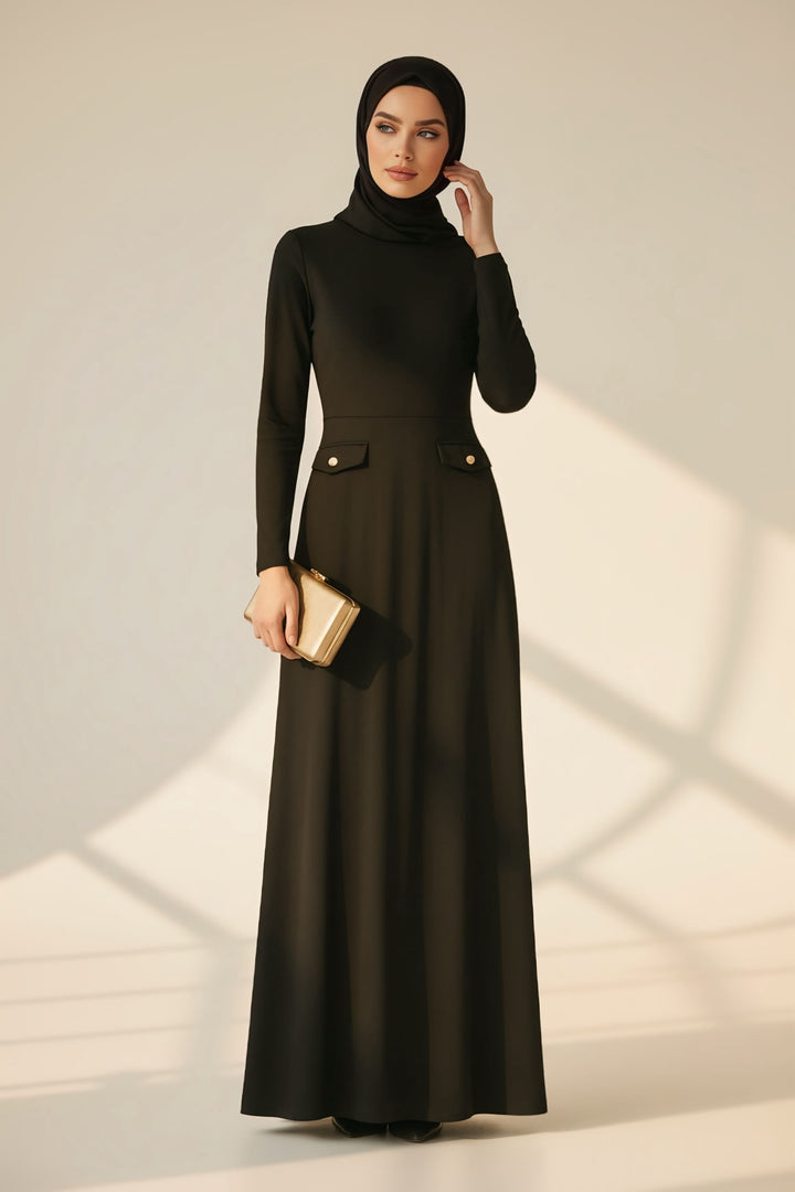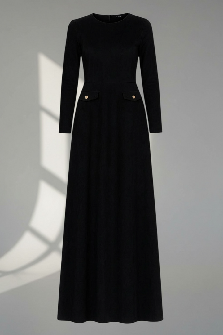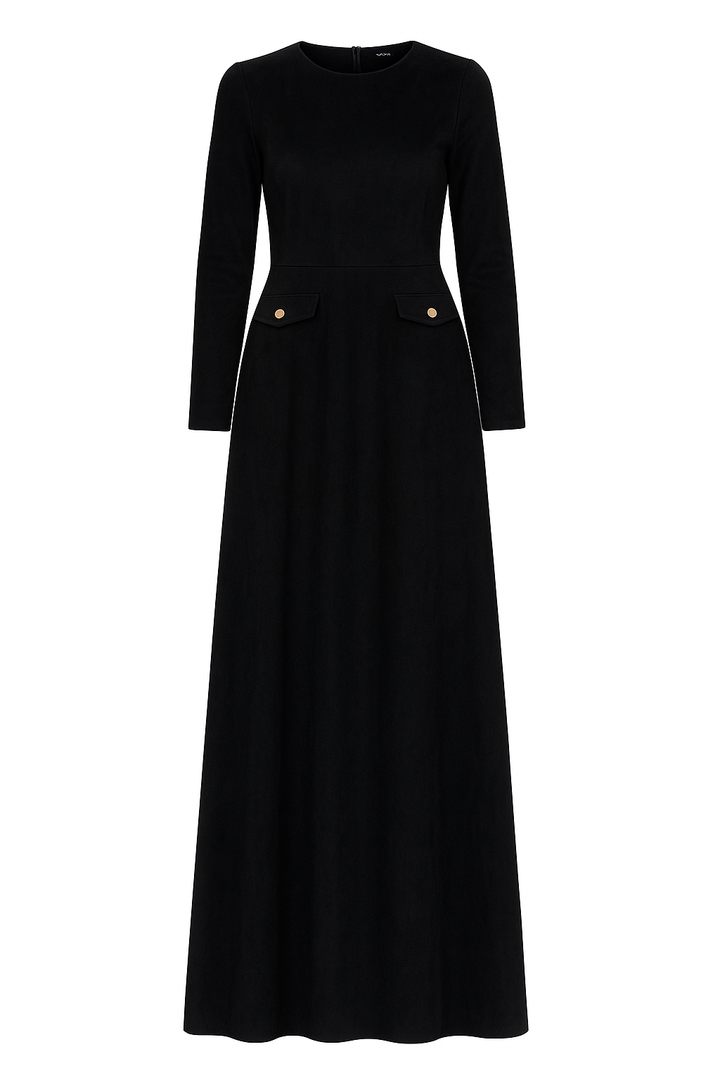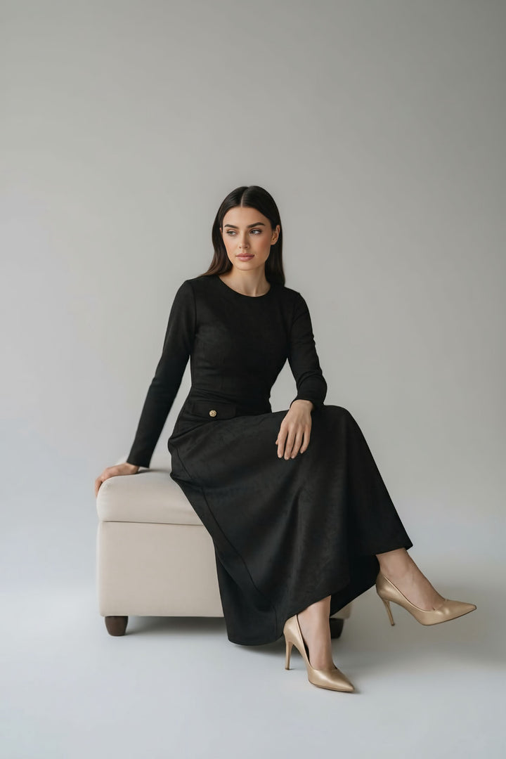 The flattering A-line silhouette enhances the waist and smooths the body beautifully, making it suitable for all body shapes. Its suede finish gives it a rich winter feel — the ideal dress for your evenings, special events, and any moment you want to look elegant effortlessly.