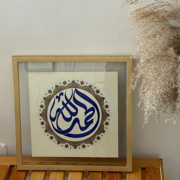 This stunning frame includes the sacred phrase “Alhamdulillah”, this calligraphy piece is hand-written in navy blue ink on decorative paper.