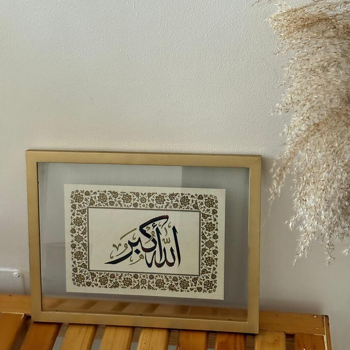 A refined and powerful statement piece, “Allah Akbar”. Encased in a soft gold frame and detailed with intricate Islamic patterns, it’s perfect for prayer corners, home decor, or as a meaningful gift during Islamic occasions.