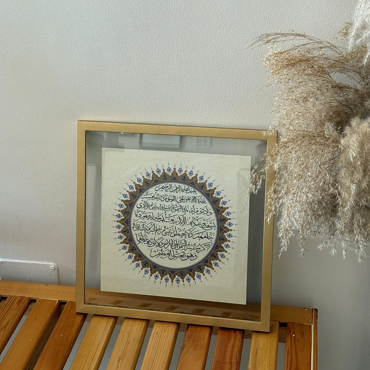 This elegant frame features Arabic calligraphy with the verse “Ayat Al-Kursi”. The text is meticulously handwritten in classic black ink on decorative paper, exuding timeless beauty and reverence.