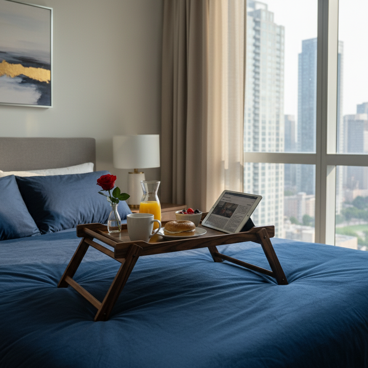 It features a smooth wooden surface and sturdy foldable legs, making it both beautiful and practical. Perfect for serving breakfast in bed, coffee, or snacks with a warm, cozy touch.