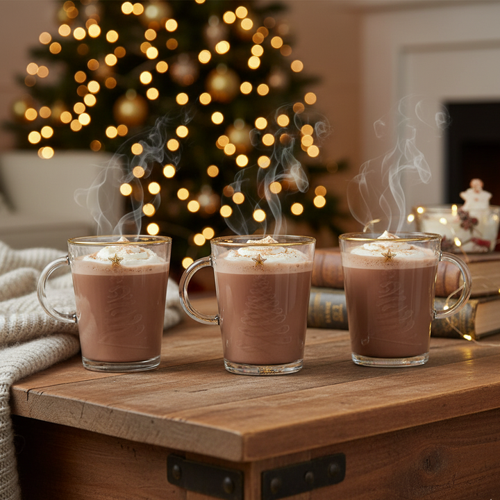 These glasses are perfect for serving up eggnog, hot cocoa, or any other festive drink. The frosted Christmas trees add a whimsical touch to the glasses, while the gold rim and star add a touch of luxury and glamour.