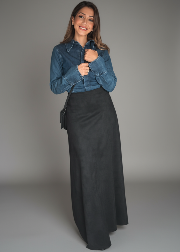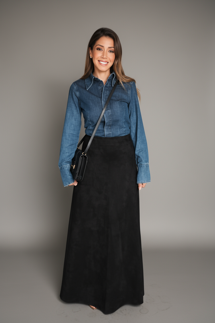 Effortlessly chic with a touch of vintage charm — the Suede Maxi Skirt is a statement of understated elegance. Crafted from soft-touch faux suede, it flows beautifully with every movement, offering both comfort and sophistication.