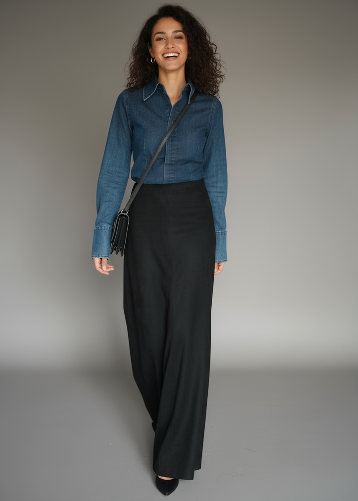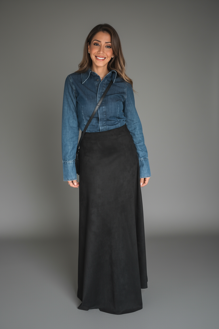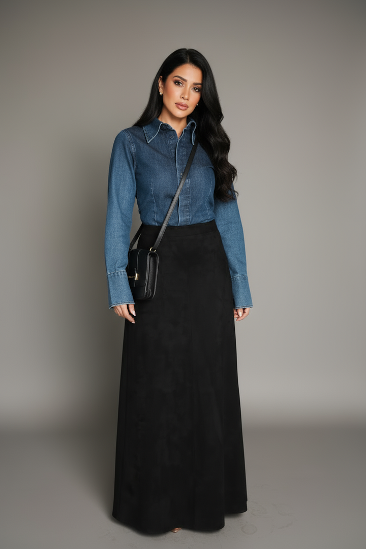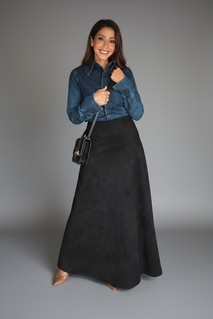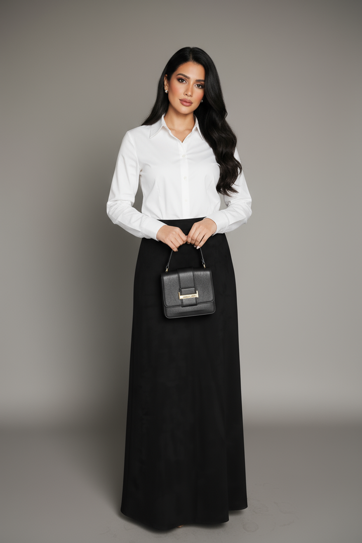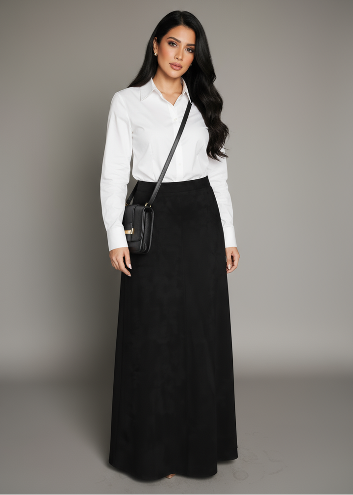 أناقة بانسيابية و نعومة ولمسة من الفخامة الكلاسيكية — تنورة السويد الطويلة قطعة تجمع بين البساطة والرقي.